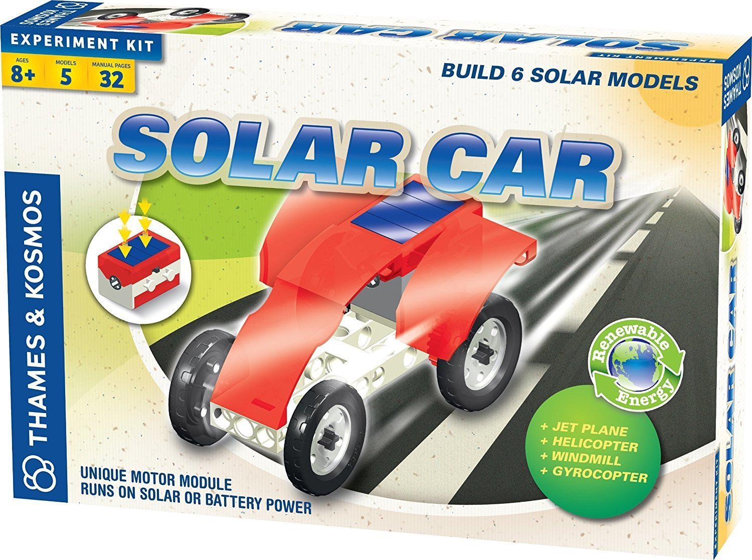Construct a solar-electric car and four additional models;Build a race car that drives across the floor;Learn how solar cells convert energy from sunlight into electricity